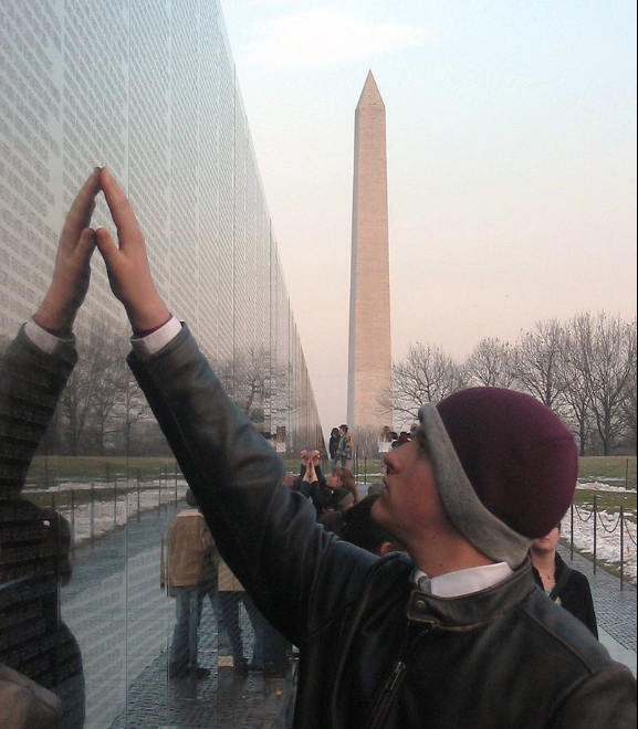 A visitor touching a name on The Wall at the Vietnam Veterans' Memorial. See this page for details concerning this pictures origins. Photographed by en:User:Skyring 26 January 2005