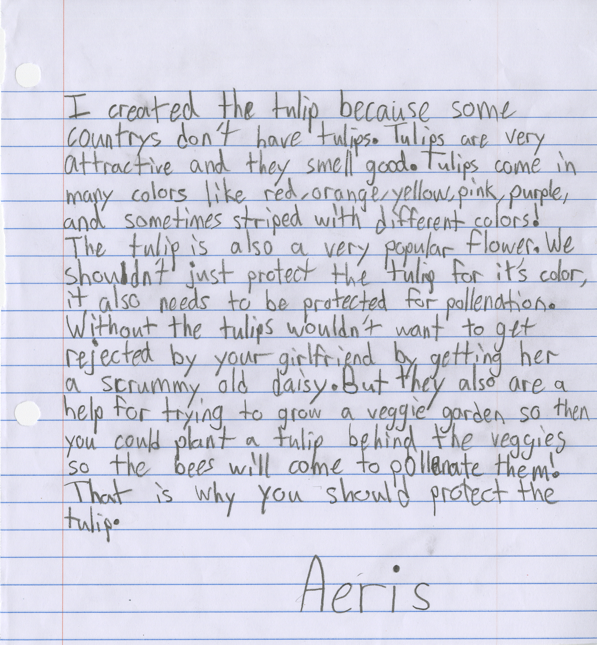 Daniel and the students also compiled an accompanying catalogue consisting of drawings of their chosen objects and a short paragraph of why they chose that object and the significance it has to them. The students’ drawings and written responses are highly effective and while many have a humorous tone, the overarching theme is one of loss, when recognizing that perhaps some or all of these entities will no longer exist in the future. According to Daniel, the students asked poignant questions while they were working such as: “how will (future) kids know what a snake really looks like when it moves if it is extinct?”