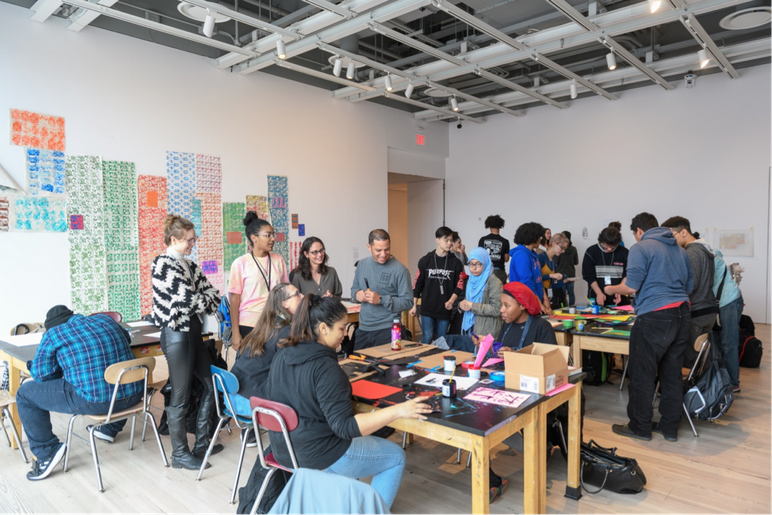 The first incarnation of Salón-Sala-Salón was realized in Puerto Rico where students from the Rafael María de Labra public school attended classes at the Museo de Arte Contemporáneo de Puerto Rico. The second, occurred at the Whitney Museum during its esteemed Biennial in 2017. Desks and materials from the Lower Manhattan Arts Academy were moved into the museum, and students reported for their art class there for the duration of the exhibition. Salón-Sala-Salón is the physical embodiment of Luis Camnitzer’s text-based public artwork, A Museum is a School (2009-ongoing), which states that “The museum is a school, where artists learn to communicate and the public learns to make connections.” Students attended classes when the museum was closed so that their privacy would be respected. Their work (both finished and in progress) was then presented to the public, who were given access to the classroom during museum hours. After a few incidents of museum goers using the classroom supplies, students decided to incorporate the viewers into their space by posting a notice encouraging them to create their own works of art, while being mindful of the students’ own work and sacred learning environment.