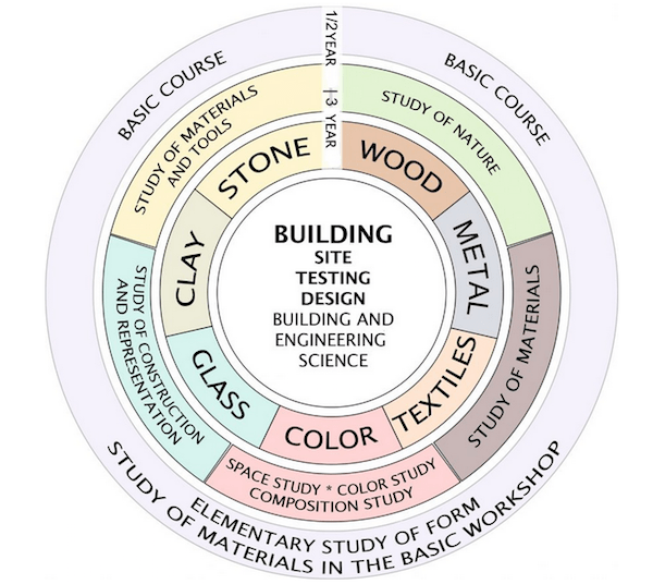 Gropius, a German architect, founded the Bauhaus school in Weimar, Germany in 1919. The school’s curriculum called for a unification of the arts and crafts. Students received balanced instruction in both the fine arts (i.e. painting and sculpture) and applied arts (i.e. design and architecture). The Bauhaus’ pedagogical program cited its core foundations via a materials based learning process. The aim of this program was to scaffold students’ understandings of spatial relationships by having them employ multifaceted aesthetic forms and principles within natural and material environments (see the circular diagram above). These are nearly synonymous to the tenets of kindergarten that nurture an individual’s passion for learning through their active participation with others, material objects and their internal and external surroundings. Modern art educator Frederick M. Logan (1950) writes that the Bauhaus and its offshoots (i.e. Black Mountain College) “is stressing, as the kindergarten tried to do in 1852, that education through vision and the sense of touch, and by means of the great richness of materials and tools now available, is all important.”