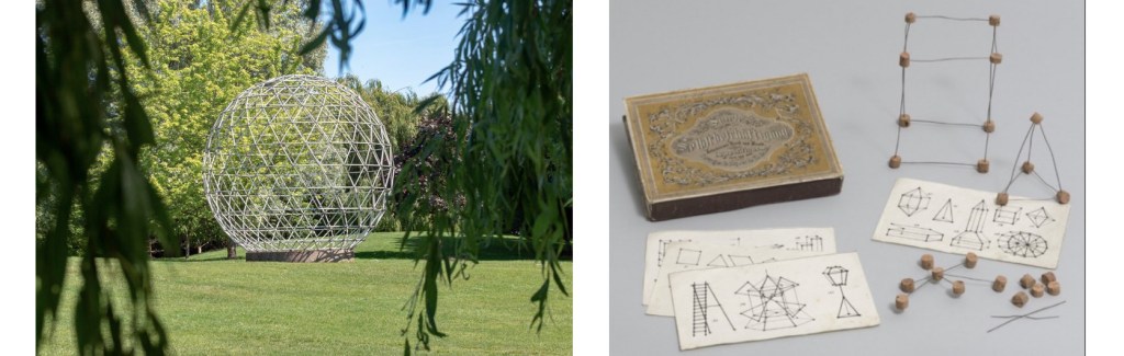 The list of visual artists, designers and architects who utilized Fröbel Gifts to explore the elements of art and principles of design is impressive. Frank Llyod Wright was given a set as a child and has mentioned how playing with the blocks encouraged his groundbreaking architectural work (see: Fröbel’s Gifts, Noguchi’s Playgrounds). Buckminster Fuller was also raised on Fröbel’s manipulatives. His iconic geodesic dome design resembles the nineteenth Fröbel Gift (aka the Framework Gift) and the Occupation of peas work, an activity using a combination of dried peas and sticks to build a variety of complex three-dimensional structures.