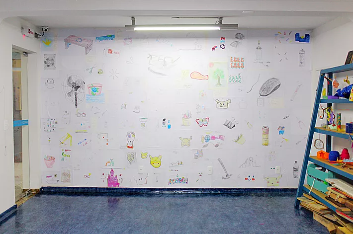 Novaes’ pedagogically infused artwork reflects Freire’s drive for epistemological equality and equity. This is evident in the collaborative mural-like work, Observation draw as an intervention (2018). The cultural organization, SESC São Caetano, invited Novaes to create a work of art for their art and technology site. He proposed that any work of art within the shared space should reflect the people who utilize it on a daily basis. During site-specific workshops (one for adults and another for children) Novaes and the participants made observational drawings of objects that were found within the community center. During the final meetings the collective arranged the drawings on the walls, creating an aesthetic conversation about the physicality and essence of the space, as well as the interests, vision and democratic impetus to depict shared experiences and memories. The drawings are simultaneously a unified portrait and still life, which function as a living legacy that meaningfully and critically embodies communal spirit.