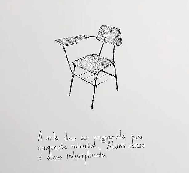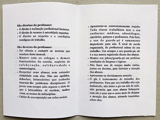 Teaching staff’s conduct manual (2018) is an installation that addresses the idealism of academic and social performance. It includes an edited compilation of rules that are sourced from conduct regulation documents, which are given to teachers upon employment and at the beginning of each school year. Novaes published these rules as a re-presented guidebook and distributes free copies whenever the work is exhibited. Novaes accompanies the publication with ten ink drawings depicting a school environment that is informed by the standards and codes described within the guidebook.