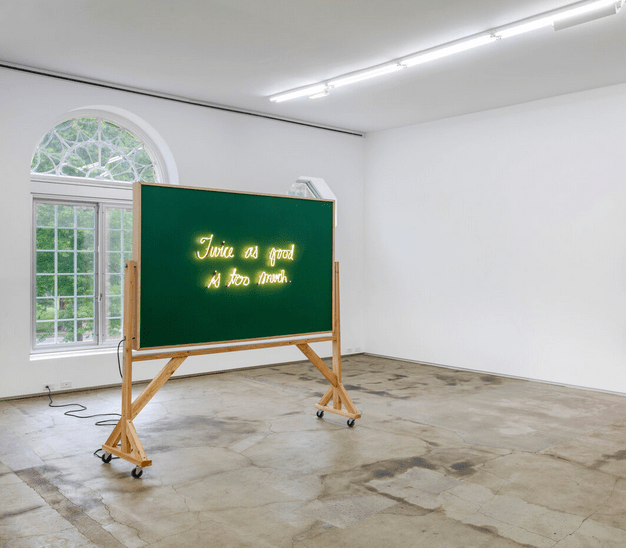 Ej Hill‘s chalkboard sculpture, Lesson #2, is a rejection of the pedagogical, philosophical and political status quo, which has lifelong implications for Black students. The neon text “Twice As Good Is Too Much,” claps back at an old proverb that in America, Black individuals need to “work twice as hard (as white folks) to get half as much.” In the article, “The Problem with Being Twice As Good,” author Lee Edward Colston II, writes that this ideology is actually upholding white supremacy, and has a draining social, emotional and cognitive effect on everything from early childhood to professional development. How does it do this? He explains that it “centers the traumas white supremacy has inflicted on us as the motivation for our drive” (Colston, 2018). This drive repudiates the ways in which we learn well from our failures and mistakes. It shows our shared humanity. Colston II (2018) explains that “The unanticipated consequence of trying to hide our failures and hurts by being ‘twice as good’ is we are complicit in distorting the reality of white people’s experience of black people. We become partially complicit in helping them to hold us to a higher standard than our white peers. It’s easy for folks to falsely believe that ‘we don’t feel pain’ when we refuse to show it.”