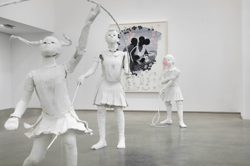 Installation view of Feedback, Jack Shainman Gallery, The School, Kinderhook, NY; featuring Karon Davis’s Double Dutch Girls (2021) and Kerry James Marshall’s Vignette #7 (2005).