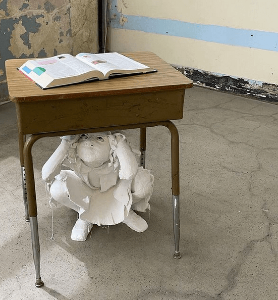 School and educational iconography are well represented through the artwork on view in Feedback. Karon Davis’ cast sculptures portray two starkly different realities about being a student in America. A group of girls jumping rope represents the social benefits of education through play and collaboration; while the girl cowering under her desk addresses school safety issues, especially the increasing amount of students who are subjected to gun violence on campus.