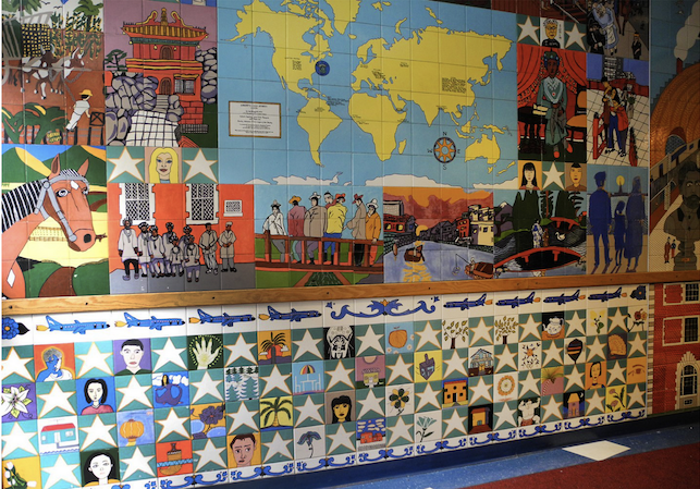 In another part of the mosaic, rectangular tiles depict various activities, scenery and iconography that is reflective of the many cultural backgrounds within the school’s student body. Each student is also represented through their self portrait.