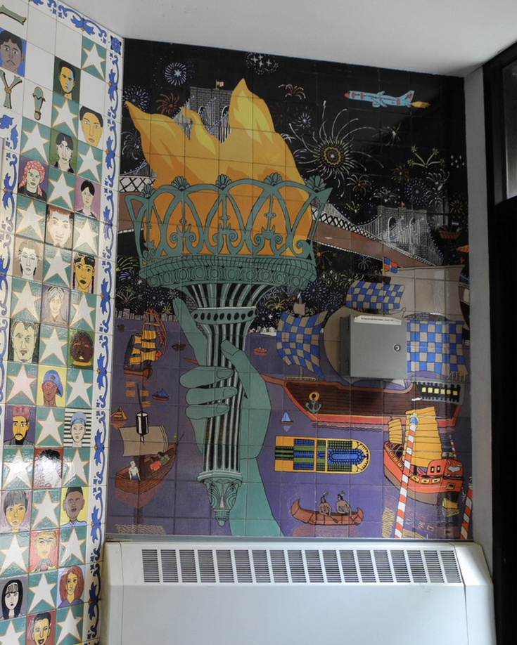 Liberty – Our Story, slightly resembles another collaborative mosaic that Brozgol created in 1994, called the Greenwich Village Murals, which are permanently on view in the Christopher Street-Sheridan Square station of the New York City Subway system. This project, like Liberty – Our Story, was realized in collaboration with local school students (I previously wrote about the Subway murals here). The partnership between a professional artist and public school students, provided fresh perspectives on historical, social and cultural narratives.
