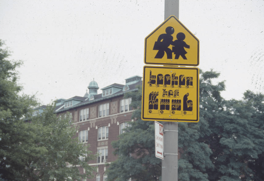 One of Martin Wong’s Traffic Signs for the Hearing Impaired (1990) installed next to St. Joseph’s School for the Deaf in the Bronx. Courtesy of Public Art Fund.