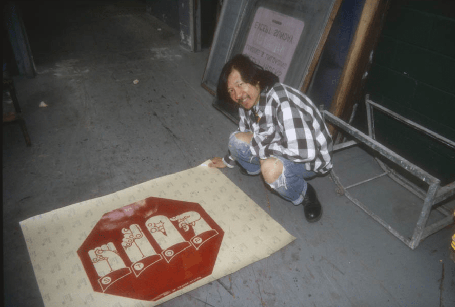 Martin Wong with a stop sign from his Traffic Signs for the Hearing Impaired series of public artworks (1990).