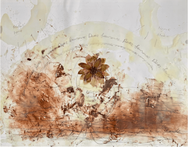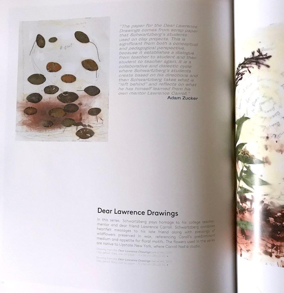One of his key mentors was the late artist, Lawrence Carroll. Schwartzberg pays homage to his dear friend and supporter in a series of text and mixed media drawings. These drawings combine Schwartzberg’s text drawings and biologically influenced works on paper. In these compositions, Schwartzberg combines heartfelt messages to his friend along with a floral motif. Many of the drawings contain pressings of wildflowers covered and preserved in wax. This is a notable addition, because flowers frequently appeared in Carroll’s work and encaustic was his predominant medium. The flowers that Schwartzberg incorporates are native to Upstate New York, where Carroll had a studio. The paper for the Dear Lawrence drawings comes from the scrap paper that Schwartzberg’s students used while working with clay. This is significant from both a conceptual art and pedagogical perspective, because it establishes a dialogue from teacher to student and then student to teacher again. It is a cycle that is a metaphor for the learning process and the collaborative and dialectic relationships between students and educators, mentors and mentees.