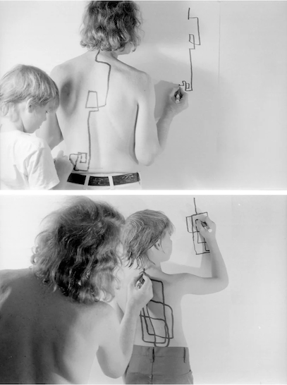 Afterwards, the pair switched places and repeated the action. Regarding this latter endeavor, Oppenheim states: “As I run a marker along Erik’s back, he attempts to duplicate the movement on the wall. My activity stimulates a kinetic response from his memory system. I am, therefore, drawing through him. Sensory retardation or disorientation makes up the discrepancy between the two drawings and could be seen as elements that are activated during this procedure. Because Erik is my offspring, and we share similar biological ingredients, his back (as surface) can be seen as an immature version of my own….in a sense, I make contact with a past state.”