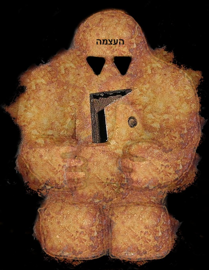 A rendering of the Prague golem from photographs of potato latkes. The word on its head is the Hebrew word for empowerment.