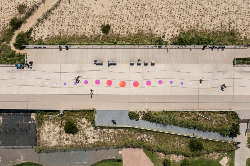 When New York City was slowly and cautiously responding to the initial months COVID-19 pandemic, Kasper was working remotely on ways to fulfill our need to socialize and feel connected, while still adhering to necessary public health and safety measures (i.e. social distancing). He held brainstorming sessions with diverse, intergenerational populations over Zoom to formulate a collective notion about self-help and mutual aid. The result was Soft Spots (2021), an installation along Rockaway Beach’s boardwalk in the borough of Queens and Stapleton Waterfront Park in the borough of Staten Island from September 2021 through February 9, 2022.