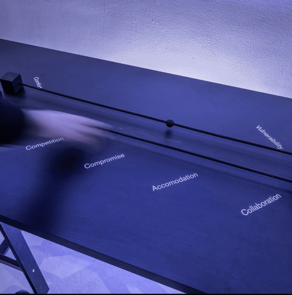 The implementation of game play and comfort stations within art installations is especially transformative in gallery settings where people sometimes might feel uncomfortable and even anxious. Applying artistic behaviors such as embracing ambiguity (see: Faller, 2021) and making creative judgements in the absence of rules (see: Eisner, 2002 and Eynon-Lynch and Wenger, 2015) can help us navigate the space between feeling vulnerable and comfortable.