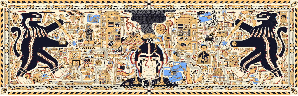 Veldhuis’ Eigen Schuld (2021) is a large tapestry full of symbolic forms and figures related to the burden student loan debt has on a variety of individuals and groups throughout society. The title is a play on words in the Dutch language meaning either “your debt” or “your fault.” This double entendre represents the ways in which student loan debt impacts the overall quality of life of a former student, as well as the negative connotations some people have for those who are suffering while trying to pay off their loans. The latter retort is common among socially or economically conservative sectors, who misunderstand the issue of student loans being predatory and cannot empathize with those who unfortunately have to rely on them to get the type of good education that everyone deserves. A common misconception among those who argue against student debt relief is that these borrowers are young, entitled and are a burden on the economic system and society at large. That argument is factually unsound and an activist named Alan Collinge is working to dispel these narratives to show how “claims that loan cancellation would unfairly benefit people who don’t need it, and even increase the wealth gap are nonsensical” (Collinge, 2020).