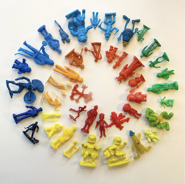 Housham’s acquiring and cataloging of these objects transforms each item into a raw material for new aesthetic compositions, in a series she calls “Found and Chosen.” Once Housham hones in on a group of miniature toys that peaks her interest, she arranges them chromatically or thematically, sometimes both ways. The project is rooted in personal nostalgia, but also a keen awareness of the need to be environmentally conscious when creatively working in a materials-based method.