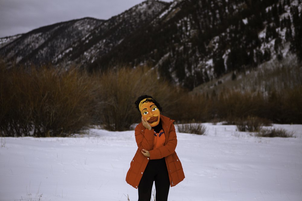 In American Dream Girls Feitosa wears handmade terracotta masks and poses in nature to embody namoradeiras figures, which are popular Brazilian home decorations that are typically affixed to windows or balconies. These figures are said to represent girls who are awaiting their “sweethearts.” Transferred to the cold and wooded landscape of Colorado, Feitosa detaches the namoradeira from her traditionally static and subservient position and into the vast American wilderness where she might be subjected to fetishization by Western pioneers. Feitosa explains that, “through the embodiment of the namoradeira, I was interested in staging gestures of longing and desire that are both highly visible yet difficult to access and interpret. This body of work has also begun to touch upon my interests in alienation, escapism and the myth of Western ‘discovery’ at the expense of the colonized body across time and continental borders.”