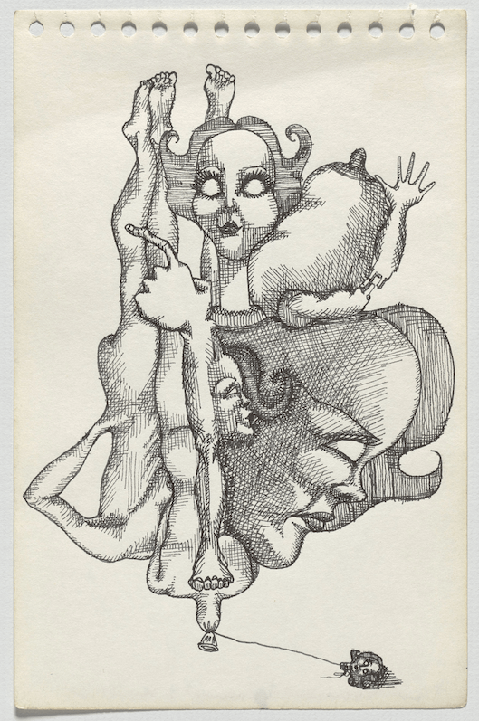 Piper’s drawings hearken back to the Surrealist game of “Exquisite Corpse” where participants blindly contribute a piece of anatomy to a drawing of a figure. The figure often becomes more absurd with each player’s addition. The dolls which Piper based the compositions on have been broken down and reconstructed so that they are anatomically incorrect with exaggerated features. Cultural critic Emily Colucci (2018) aptly notes that “Piper rearranged and reconfigured her parts, turning her into the monstrous creation she always was.”