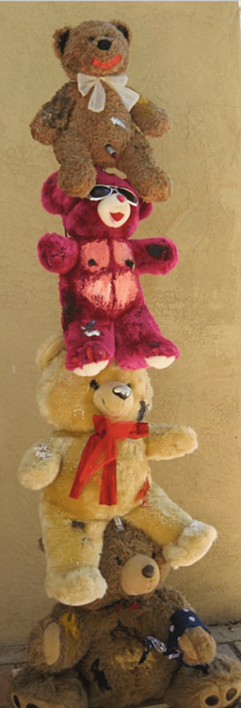 Another body of work from Buffalo Hyde’s oeuvre is his “Teddy Bear Totem” series. Creating sculptures using mass produced toys to resemble totem pole structures addresses the commodification of Indigenous American culture. Across the United States, totem poles have become divorced from their initial purpose. They are sold in gift shops and used as roadside attractions or advertisements to sell goods or services. All too commonly, appropriating totem poles is an endeavor carried out by non-Native individuals and businesses. This is even more egregious considering the colonial United States and Canada has had a fraught history with allowing Indigenous peoples to celebrate their cultural heritage and make a living from their crafts. An example is the Canadian government’s ban (from 1184 to 1951) on potlatches, which is a ceremony whereby Indigenous communities gather to destroy items of wealth or commodity in order to refocus and reaffirm their commitment to family, tribal nation and the spiritual and natural realms. Therefore, marketing totem poles as trinkets and tourist traps is an action of white supremacy that displaces both the spiritual object and the originators of these symbolic structures.
