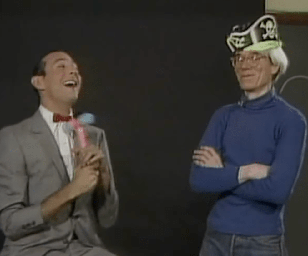 Reubens had a distinguished artistic background prior to creating Pee-wee. Starting at age five, he would act out plays with his siblings on a stage he asked his father to build. He studied acting at the California Institute of the Arts, which has a legacy of producing alumni who successfully integrate the serious undertakings of making art with a prevailing jovial attitude. As he was ascending up the ranks of comedy and show business notoriety, Pee-wee rubbed elbows with established art world figures, including pop artist Andy Warhol. In 1983 Pee-wee visited Warhol’s New York City studio as a special guest on Andy Warhol TV, where he bopped Warhol on the head repeatedly with a toy hammer, and discussed his arsenal of toys that he used during his stand-up routine with author and artist Maura Moynihan.