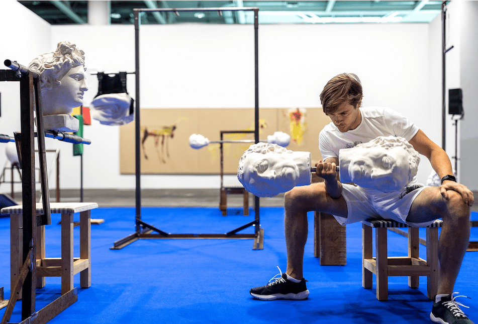 Researching the work further, I was elated to learn that there is also an educational themed component. Čiurlionis Gym was influenced by Serapinas’ experiences as a student at the National M.K. Čiurlionis School of Art in Lithuania (named after one of Lithuania’s best known modern artists, Mikalojus Konstantinas Čiurlionis). The school employs a very traditional pedagogical framework focused on building technical skills in the plastic arts (i.e. drawing, painting and sculpture) by having students copy what they see in nature, and making recreations of classical artworks, such as ancient Greek and Roman sculpture. The plaster replicas of classical sculpture he made in art school are incorporated into the design of the fitness equipment in Čiurlionis Gym. During the opening day of Art Basel, Serapinas and a group of performers exercised with the equipment for five straight hours; and subsequently performed in intervals of thirty minute sweat sessions throughout the duration of the five day long art fair.