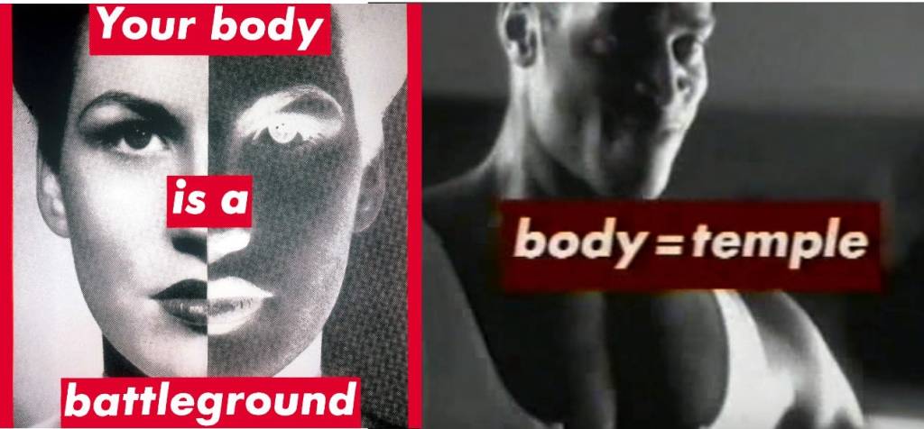 Below is a side-by-side comparison of Kruger’s Untitled (your body is a battleground) from 1989 and a still from the aforementioned 1993 Bally Total Fitness commercial: