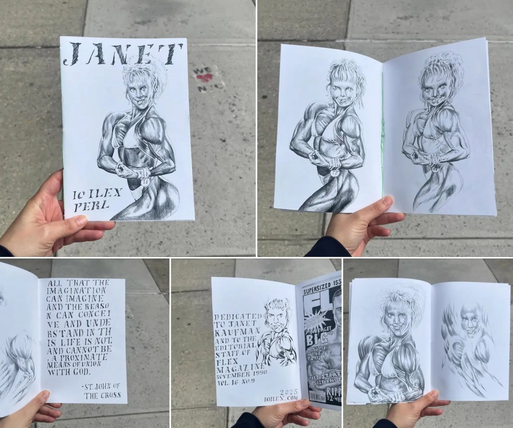 In a zine by artist and anthropologist Io Ilex Perl, titled Janet, intricately rendered drawings referencing a photograph of bodybuilder Janet Kaufman (which were initially published in the reader mail section of the November 1998 issue of former bodybuilding magazine, FLEX) address the push and pull between the profane and sacred within the culture of bodybuilding.