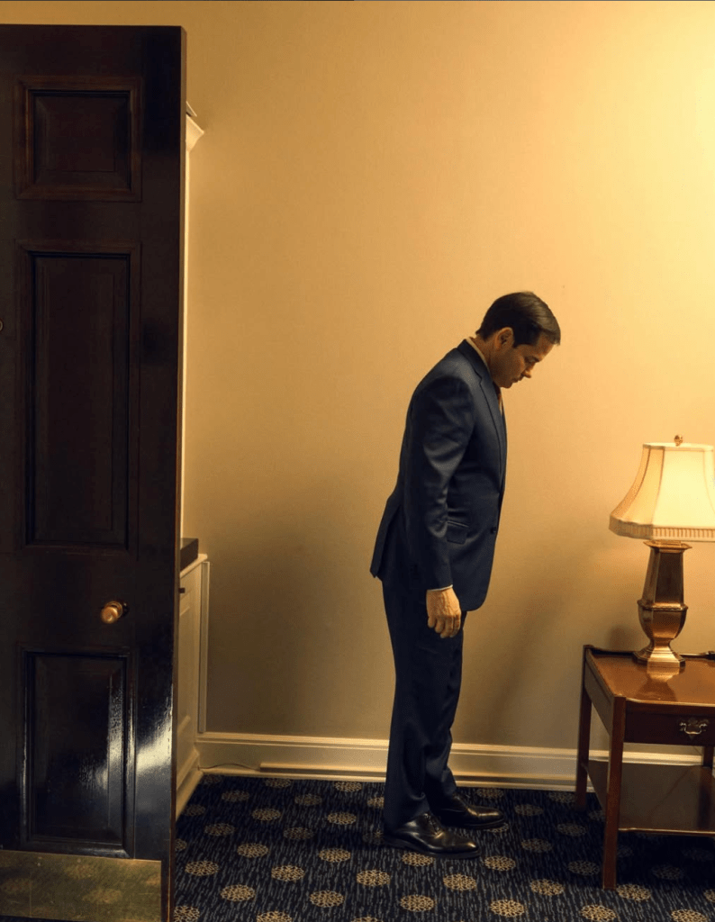 The most absurd image from the series is of Secretary of State Marco Rubio, who is portrayed from the side, subtly hunched over and staring into a table lamp as if he’s subservient to its dim and dull glow. With his awkward and obedient stance, the photograph brings to mind the nickname “Little Marco” that his former rival and current boss gave to him.